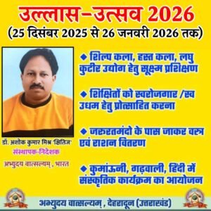 वसुधैव कुटुम्बकम की भावना से अनुप्राणित ‘अभ्युदय वात्सल्यम्’ उदात्त मानवीय संवेदना, सहिष्णुता, साहचर्य, सामंजस्य एवं समरसता की अभिवृद्धि हेतु सतत प्रयत्नशील एक महापरिवार है। चतुर्दिक सुख-समृद्धि भातृत्व भावना से अभिप्रेरित यह महापरिवार सम्पूर्ण विश्व के समस्त मानव जाति के लिए सम्मानजनक आय, समुचित आवास, एवं समुचित शारीरिक आवरण की उपलब्धता हेतु उदात्त भावना से अहर्निश प्रयत्नशील हैं। अशिक्षा, रोग, बेरोजगारी, भय, अमानवता, भ्रष्टाचार के विरुद्ध इस महापरिवार द्वारा सक्रिय, संतत, जनोन्मुखी महाअभियान चलाया जा रहा है। यह महापरिवार पर्यावरण (संस्कृतिक, जैविक, अजैविक) की शुचिता एवं संतुलन लिए प्रयासरत है। नारी के यथेष्ट सम्मान एवं आत्मा गौरव के लिए यह परिवार दृढ़प्रतिज्ञ है।